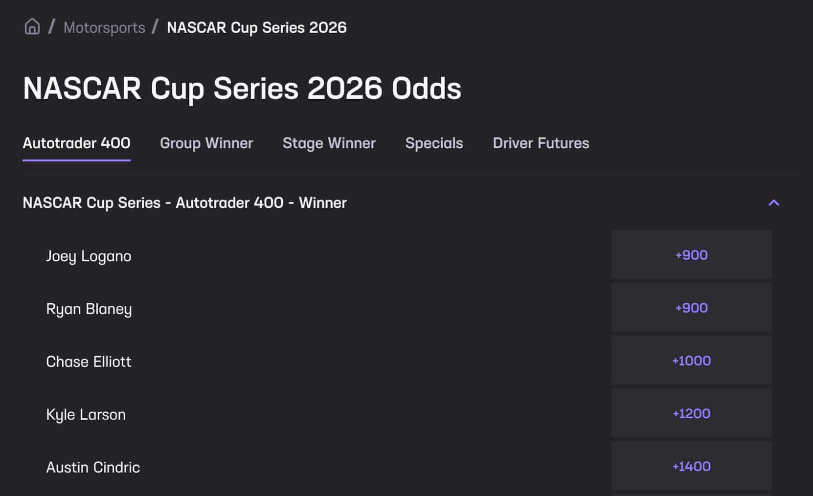 Here’s a look at the available betting markets, along with every driver’s odds to win the 2026 Autotrader 400 at Hard Rock Bet.