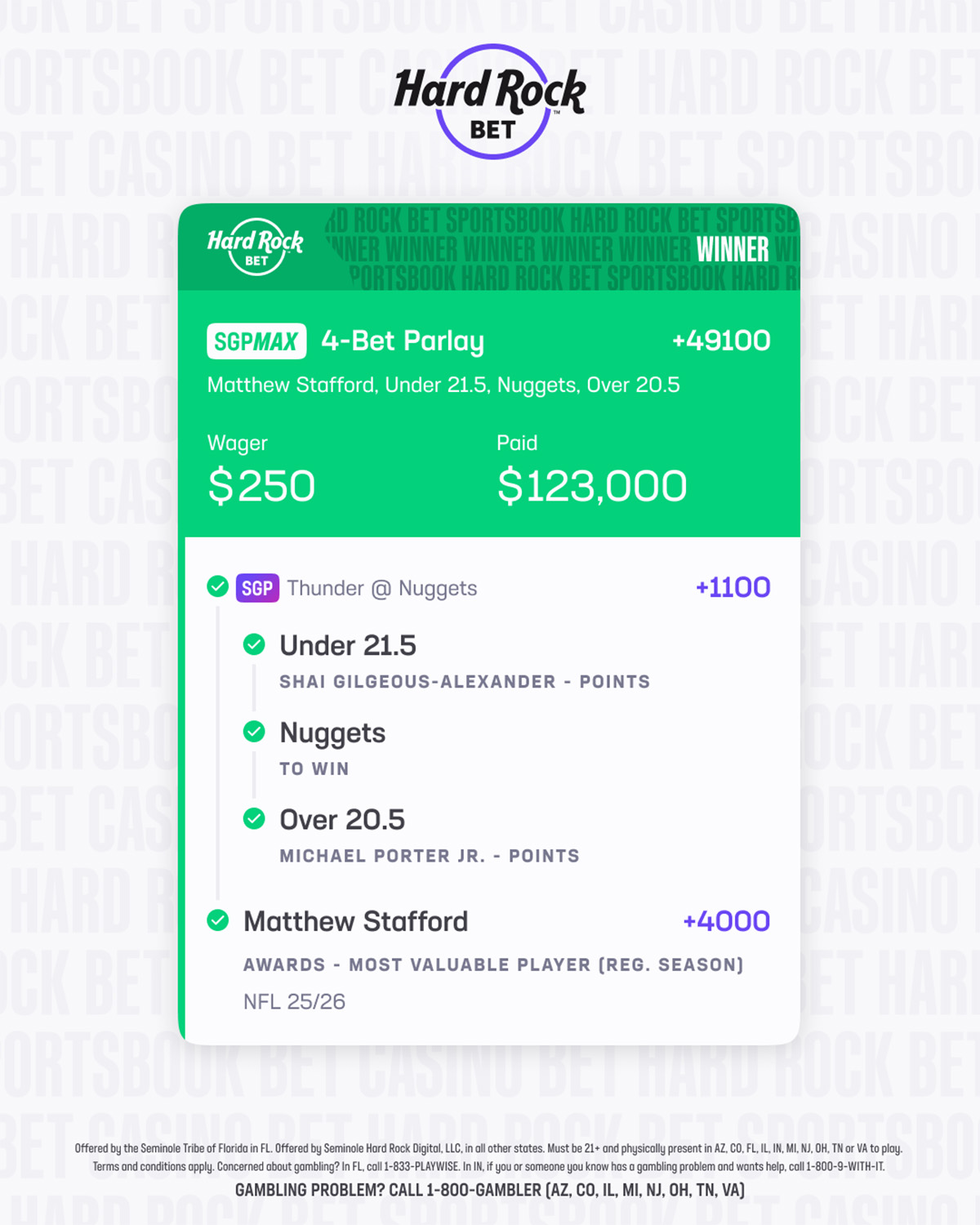 When awards season finally arrived the MVP conversation had narrowed to just two: Patriots QB Drake Maye and the 17-year veteran in LA, Matthew Stafford. When it was officially announced that Stafford had won his first MVP award, few were happier than our Miami-based bettor, who turned a $250 stake into a $123,000 payout.